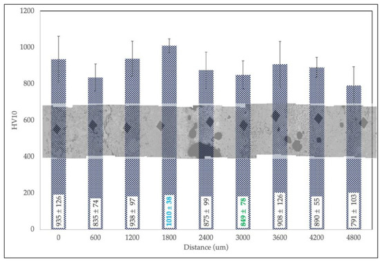 The hardness properties of the coating after the PFHTs performed at different temperatures and dwelling times are collected in the bar chart of Figure 17. The mean macrohardness values (HV10) are reported as bars, whereas the error bars represent standard deviations.