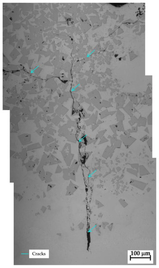 Internal cracks are common defects that appear in AM components, especially in WC-Co materials, usually due to the development of high thermal stresses during the process. Hence, their occurrence must be controlled [13,28,29,30,31,32]. Some research demonstrated that these stresses are generated during solidification [33,34]. Depending on the material properties and the process parameters, when the material is in a mushy state, with continuous and semi-continuous liquid films at the grain boundaries, the restricted resistant area is not able to support the stresses arising from the thermal constraints, thus inducing the generation of cracks [33,34]. In the literature, there are several studies regarding these mechanisms [35,36,37] with both the steep variation of the temperature induced by the AM process and the material properties considered the main key factors in crack generation. When stresses trapped inside the component are suddenly released, cracks emerge on the surface. Once a crack has occurred, it spreads along the molten layer, affecting the soundness of the deposited material.