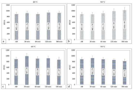 (a–d) Mean Vickers macrohardness of samples in different PFHT conditions.