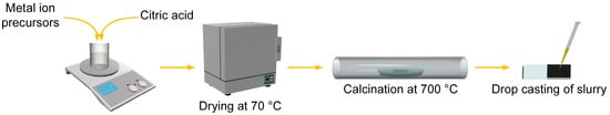 Schematic illustration of the synthesis of HEO-3CNF powders using a citrate method and fabricating electrodes on FTO using the drop-casting method. The slurry is a mixture of HEO-3CNF, terpineol, ethyl cellulose, acetic acid, and ethyl alcohol.