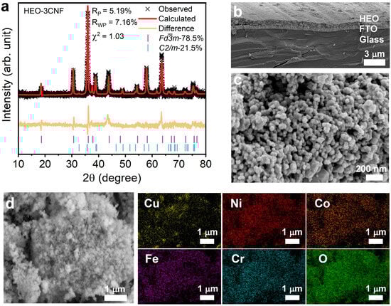 (a) Rietveld refinement of XRD patterns, (b) side view, and (c) enlarged view of HEO-3CNF-based electrodes on FTO using the drop-casting method, and (d) SEM image used for EDS analysis and EDS mapping results for as-prepared HEO-3CNF powders.