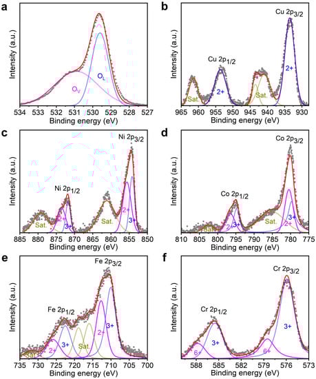 High-resolution XPS analysis for HEO-3CNF powders. Deconvoluted XPS spectra of (a) O 1s, (b) Cu 2p, (c) Ni 2p, (d) Co 2p, (e) Fe 2p, and (f) Cr 2p Dots (gray) and lines (red) are the measured data and fitted results. Deconvoluted lines represent different oxidation states (blue and pink) and satellite peaks (olive).