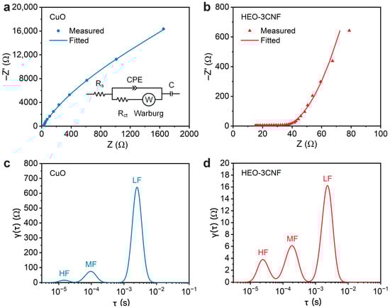 Electrochemical impedance spectra for (a) CuO and (b) HEO-3CNF-based electrodes and corresponding DRT curves (c) and (d). The EEC model used to fit the impedance data is shown. Ar-saturated solutions were used.