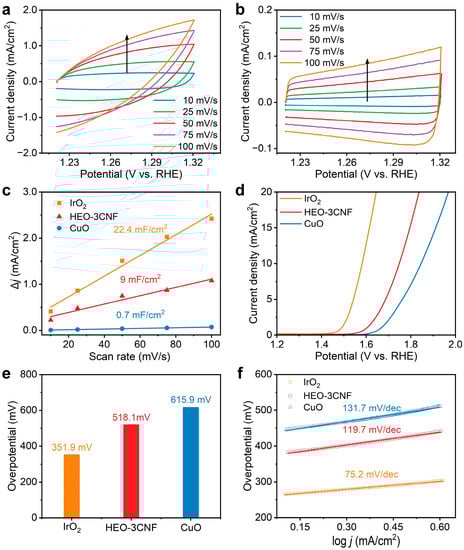 After the characterization of HEO-3CNF, we investigated its potential applications in water electrolysis (Figure 5). Figure 5a,b show CV results of the HEO-3CNF and CuO electrodes at different scan rates, indicating the presence of electric double-layer capacitance. The scan-rate-dependent increase in integrated areas describes the possibility of reacting with electrolytes. The double-layer capacitance (Cdl) was calculated by plotting the current density and scan rate at a selected potential. As shown in Figure 5c, HEO-3CNF has a much better capacitive capability for potential supercapacitors than CuO. Then, the applicability of HEO-3CNF for electrocatalytic water splitting was examined by measuring OER activities. As summarized in Figure 5d, the iR-corrected polarization curve [] of HEO-3CNF was compared with those of CuO and IrO2. The overpotentials at 10 mA/cm2 of IrO2, HEO-3CNF, and CuO are 351.9, 518.1, and 615.9 mV (Figure 5e), which agree with previous results (IrO2: 351 mV and CuO: 580 mV) [,]. Shown in Figure 5f are their Tafel slopes with 75.2, 119.7, and 131.7 mV/dec. As reported, multi-phase catalysts can increase active adsorption sites and boost charge transfer between catalyst surfaces and adsorbents [,], leading to higher OER performance. This study demonstrated that the novel HEO-3CNF-based OER electrodes enhance their performance compared to CuO, which can be applied in various energy devices (i.e., supercapacitors and alkaline water electrolyzers).