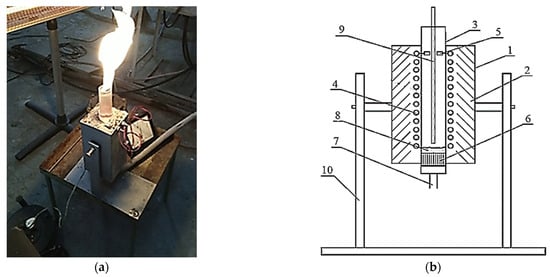 The experimental reactor (a) and its design scheme (b): 1—outer casing; 2—thermal insulation; 3—quartz tube; 4—heater; 5—heater clamps; 6—gas distribution lattice; 7—fitting for gas supply; 8—fluidized bed of granular Al2O3; 9—thermocouple; 10—support with the movable mechanism.