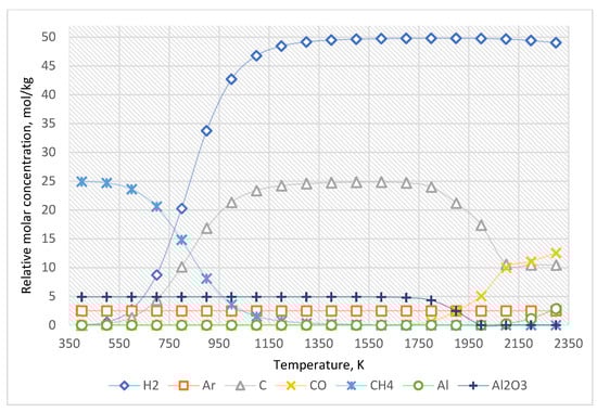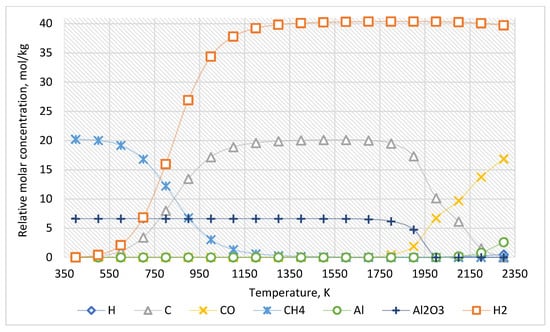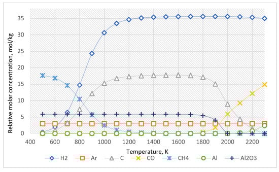 As the thermodynamic calculations show (Figure 3, Table 2), methane decomposes into hydrogen and carbon starting at 600 K. As the temperature increases, the yield of carbon and hydrogen increases. Initially, carbon is deposited as ash and pyrocarbon, acting as a reducing agent. In this system, a molecule of Al2O3 is stable until the temperature of 1500 K. If temperatures exceed 1500 K, the carbon formed from methane begins to recover Al2O3 to Al with the formation of CO. Therefore, the Al2O3 content slightly decreases in the 1500–1900 K temperature range. However, above 2000 K, the Al2O3 content decreases significantly and approaches zero. The Al content increases above 2000 K. Moreover, at temperatures above 2100 K, the concentration of atomic hydrogen formation increases. This result corresponds to the fact that atomic hydrogen is released only in cases without an inert medium. The formation of molecules H2 from atomic hydrogen is significantly affected by impurities in the gas. In other words, in the presence of inert gas in the system, the formation of atomic hydrogen is observed in the initial stage. Nevertheless, then gas molecules H2 are formed. In contrast, for multicomponent systems with noninert components, the formation of H2 occurs immediately. This explains the difference in data presented in Table 2, Table 3, Table 4 and Table 5.