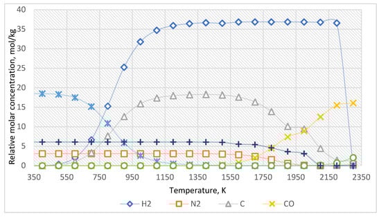 According to the evaluated data (Figure 4, Table 3), before the temperature of 1500 K, nitrogen does not significantly affect the target reaction products. Nevertheless, if the temperature exceeds 1500 K, the formation of various nitrogen-containing compounds with carbon and hydrogen is possible in the system. The reduction of Al2O3 to Al when nitrogen is added to the system occurs at a slightly higher temperature (over 2100 K).