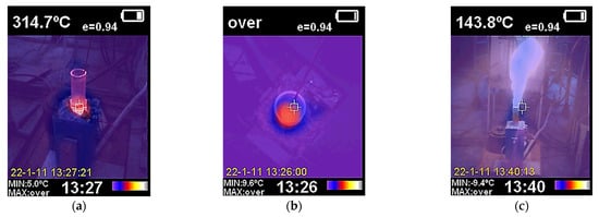 The pyrometer “IR-866 U” (“FLUS”, China) was used for the measurement range of 220–2550 K, and the measurement error of ±1.5% + 2.0 K. The K-type thermocouple “UNI-TUT325” (“UNIT”, China) connected to a digital thermometer was used for measurements in a range of 220–1500 K, and the measurement error of ±0.5% + 1.0 K. The thermal imager “HT-04D” (“XINTEST”, China) was used to measure real-time heat loss for the measurement range of 250–680 K and measurement error of ±2%/±2 K.