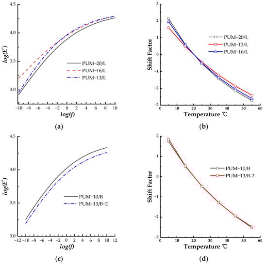 Figure 2e,f illustrates that the dynamic modulus master curves of PUM-13/B-2 and PUM-13/L did not exhibit evident regularity; the dynamic modulus of PUM-13/B-2 was smaller at low frequency and higher at high frequency compared with PUM-13/L. The shift factor of PUM-13/B-2 had higher absolute values than that of PUM-13/L, but the difference between the shift factor values at each temperature was not prominent, indicating that aggregate type had limited influence on the dynamic modulus of the PU mixture.