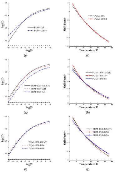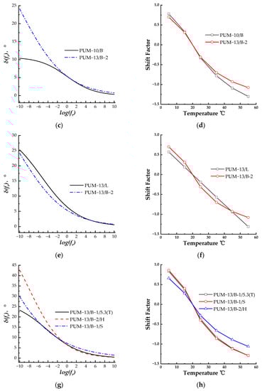 It can be observed from Figure 3g,h that the master curve of PUM-13/B-1/5.3(T) and PUM-13/B-1/S were close to that of PUM-13/B-2/H, indicating that the curing speed of the PU binder did not affect the phase angle or dynamic property of the PU mixture. However, the color additive in the PU binder could affect the phase angle of the PU mixture. The shift factors also supported the conclusion, as the shift factors of PUM-13/B-1/5.3(T) and PUM-13/B-1/S possessed comparable values and were less than the absolute values of PUM-13/B-2/H.