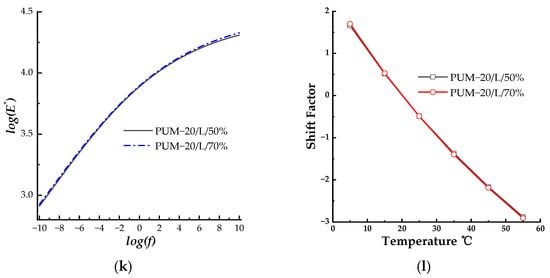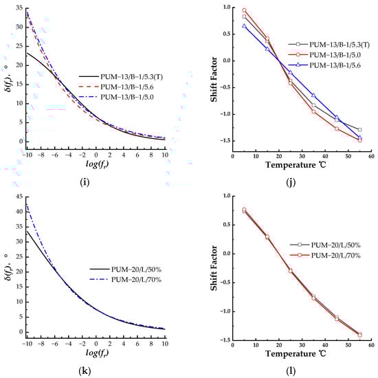 It is found from Figure 3k,l that the master curves of PUM-20/L/50% and PUM-20/L/70% were nearly identical, exhibiting different values at lower loading frequencies, and the shift factors of PUM-20/L/50% and PUM-20/L/70% were nearly identical. According to the graphical analysis, the curing condition did not affect the phase angle of the PU mixture.