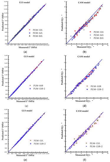 Figure 4 and Table 3 display the results of analyzing the measured and corresponding predicted dynamic modulus of the PU mixtures; these results were used to evaluate the accuracy of the master curve model. According to Figure 3 and Table 1, the data of measured and corresponding predicted dynamic modulus of the PU mixture with different features were all uniformly distributed in the line of equality (LOE), and no scattered points were observed. This phenomenon indicates that the GLS model could accurately predict the dynamic modulus of the PU mixture regardless of the mixture’s features. The linear regression method was used to fit the linear relationship between the measured and corresponding predicted dynamic modulus. The fitting results in Table 1 also prove that the GLS model had high prediction precision for the PU mixture, as the line slopes of all linear fitting results were greater than 0.99 and smaller than 1, indicating that the GLS model could slightly underestimate the measured dynamic modulus of the PU mixture with high precision. The R2 of the linear fitting results of all PU mixtures were greater than 0.99, demonstrating that the GLS model had a high level of prediction accuracy for the PU mixture regardless of the mixture’s features.