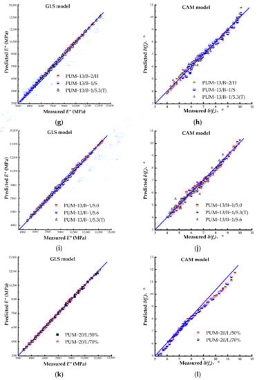 The comparison between measured and predicted dynamic modulus found by using two models. (a) GLS model results under different limestone aggregate gradations; (b) shift factors under different limestone aggregate gradations; (c) GLS model results under different basalt aggregate gradations; (d) SCM model results under different basalt aggregate gradations; (e) GLS model results under different aggregate types; (f) SCM model results under different aggregate types; (g) GLS model results under different aggregate types; (h) SCM model results under different aggregate types; (i) GLS model results under different PU contents; (j) SCM model results under different PU contents; (k) GLS model results under different curing conditions; (l) SCM model results under different curing conditions.