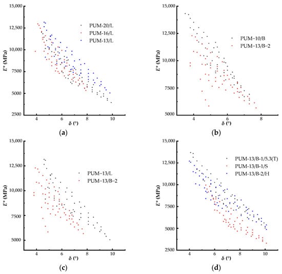 From Figure 6a, it could be observed that the data points for PUM-13/L shift to the right, whereas the data points for PUM-16/L and PUM-20/L are mixed. This may be explained by the fact that PUM-13/L would exhibit a more viscous property than PUM-16/L and PUM-20/L, but the aggregate gradation or NMAS had a slight impact on the rheological property of the PU mixture. The data points for PUM-10/B were located on the right and in the high position, whereas the data points of PUM-13/B-2 were located on the left and in the lower position, exhibiting a more dispersed distribution than the aggregate gradation, which had a relatively small impact on the rheological property of the PU mixture. This suggests that the aggregate gradation had a negligible effect on the rheological property of the PU mixture over the test temperature range; in other words, the PU binder dominated the rheological property, whereas the aggregate skeleton played no discernible role. Therefore, the only factor influencing the rheological property of the PU mixture is the PU binder.