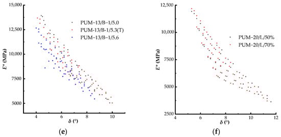 As seen in Figure 5e, the data points of PUM-13/B-1/5.3(T) and PUM-13/B-1/5.0 were closely distributed and show little difference; however, the data points of PUM-13/B-1/5.6 were slightly shifted to the lift, and part of them were mixed with the other data points of PUM-13/B-1/5.3(T) and PUM-13/B-1/5.0. This means that increasing the PU binder does not help change the rheological property of the PU mixture; in other words, when the PU binder content exceeds the optimal level, the dynamic performance is improved.