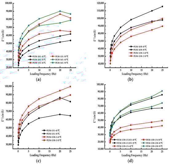 The stiffness parameters (E*/sin(δ)) are used to compare the rutting resistance of the mixture; Figure 6 represents the stiffness parameters (E*/sin(δ)) of the PU mixtures with different features.