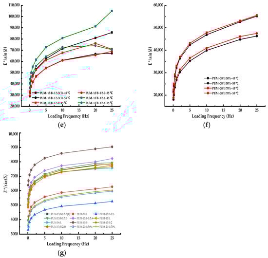 The stiffness parameters (E*/sin(δ)) of the PU mixture with different features. (a) Different limestone aggregate gradations; (b) different basalt aggregate gradations; (c) different aggregate types; (d) different PU types; (e) under different PU contents; (f) master curves under different curing conditions; (g) stiffness parameters (E*/sin(δ)) of the PU mixture with all features.