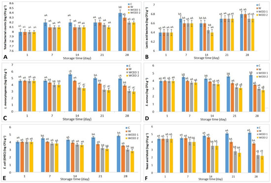 Microbial changes were obtained from un/treated Iranian white cheese samples stored at 4 °C for 28 days of storage. C: uncoated sample, W: whey protein concentrate coating, WCEO1: whey protein concentrate containing 1 percent v/v CEO, and WCEO2: whey protein concentrate containing 2 percent v/v CEO. ((A) Changes in the total bacterial count counts (log CFU·g−1) of cheese slices. (B) Changes in Lactic acid bacteria counts (log CFU·g−1) of cheese slices. (C) Changes in L. monocytogenes counts (log CFU·g−1) of cheese slices after inoculation. (D) Changes in S. aureus counts (log CFU·g−1) of cheese slices after inoculation. (E) Changes in E. coli O157:H7 counts (log CFU·g−1) of cheese slices after inoculation. (F) Changes in yeast and mold counts (log CFU·g−1) of cheese slices after inoculated with yeast and mold).