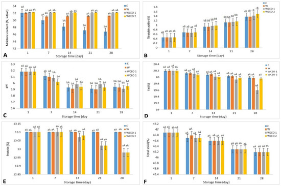 The change in moisture content (A), titratable acidity (B), pH (C), fat content (D), protein content (E), and total solids content (F) of Iranian white cheese at different treatments during 28 days of storage at 4 °C. C: uncoated sample, W: whey protein concentrate coating, WCEO1: whey protein concentrate containing 1 percent v/v CEO, and WCEO2: whey protein concentrate containing 2 percent v/v CEO.