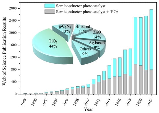 Publication trends in semiconductor photocatalysis technology. Bar graph represents Web of Science data analysis results for yearly publications from 1998 to 2022, using keywords “semiconductor photocatalyst; semiconductor photocatalyst + TiO2”, and the inset pie chart indicates the proportion of TiO2, g-C3N4, Bi-based, ZnO, Ag-based, and other semiconductor photocatalysts used in semiconductor photocatalysis technology between 1998 and 2022, respectively.