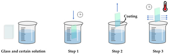 The dip-coating method is a low-cost and easy-to-operate process that is one of the most commonly employed techniques for depositing TiO2 nanoparticles (NPs) on glass materials [74]. The dip-coating method involves growing a thin film on the glass substrate by immersing it in a precursor solution containing the photocatalytic material to be deposited. The sol-gel method is often used to prepare TiO2 precursor solutions in a typical dip-coating process [75]. In addition, before depositing the photocatalytic coating, it is necessary to clean the selected glass material with plasma or wash it with a specific solution, such as acids [76], organic solvents, or neutral detergents [77]. After the precursor solution and glass substrate are prepared, the dip-coating process is started (as shown in Figure 4). The glass substrate is immersed in the pre-solution for a period of time by means of dip coating equipment, and then the substrate is extracted at a certain speed. The immersion time and dipping times can determine the coatings’ thickness. After the deposition, the obtained films are dried and annealed to promote the crystallization of TiO2. It should be emphasized that two or more precursor solutions may be used in the preparation of TiO2-based heterogeneous photocatalytic coatings.