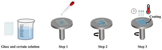 Spin coating technology is an advanced, cheap, easy-to-control uniform coating deposition technology that can be used to deposit NPs onto different substrate surfaces [82,83]. A typical spin-coating process is present in Figure 6, and the process can be divided into three stages after preparing the material and substrate. Firstly, the substrate is placed onto the cage of the spin coater, and the prepared solution is dropped onto the upper surface of the glass substrate. Then, a wet film is produced by centrifugal force during rotation. As the spinning proceeds, the excess liquid flows away from the substrate. Finally, solvent evaporation leads to the coating’s formation. Further calcination may be required to crystallize the deposited coatings for the desired application. The spinning speed and spin-coating recycling times can determine the coatings’ thickness. Thus, the thickness of the coating can be controlled.
