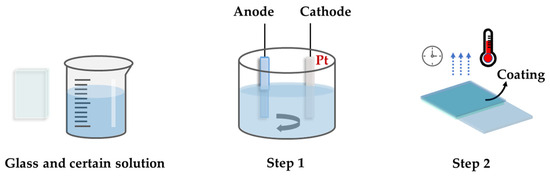 With the continuous development and diversification of technology, the electrodeposition of metal particles on conductive glass substrate has become a mature technology [95,96]. Compared with other deposition methods, electrodeposition has the advantages of low cost, short reaction time, low temperature, easy control, and environmental friendliness [97,98]. The deposition rate and time can be well controlled to obtain a uniform film with controllable composition. Specifically, a suspension for electrodeposition and a conductive glass substrate (mainly indium-doped tin oxide (ITO) and FTO glass) is prepared first. After that, the conductive glass is used as the working electrode, the Pt wire/foil is a counter electrode, and a standard calomel electrode or Ag/AgCl is used as the reference electrode to start the electrodeposition process at a certain deposition voltage and a specific temperature [99]. The coating is formed and may need annealing (Figure 12).