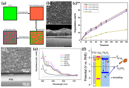 (a) Schematic diagram of FTO/TiO2/CdSe deposition process; (b) SEM images of the top-view and the cross-view of TiO2/CdSe; (c) photodegradation rate of MB under illumination, reproduced with permission from [101]. Copyright 2016, Elsevier B.V.; (d) FESEM images of the top view and the cross-view of FTO/TiO2/Fe2O3; (e) UV-Vis spectra of different samples (HT, H, and T represent FTO/TiO2/Fe2O3, FTO/Fe2O3, and FTO/TiO2, respectively); (f) the photocatalytic mechanism of the FTO/TiO2/Fe2O3 photoanodes in PEC water oxidation, reproduced with permission from [102]. Copyright 2019, Elsevier Ltd.