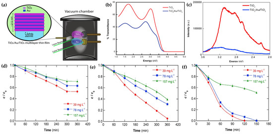 Linnik et al. [116] prepared ZrO2-doped TiO2 targets with different weight percent concentrations and then used PLD technology to deposit ZrO2/TiO2 composite coatings on glass substrates. The increase in ZrO2 content could narrow the bandgap and enhance the light absorption capability. The coatings of ZrO2/TiO2 composite were also obtained by depositing in pure O2 or mixed N2:CH4 atmospheres (5:1 or 9:1) to investigate the effects of active atmospheres on photocatalytic reduction of toxic dichromate (Cr(VI)) ions. The results showed that ZrO2 (10%)/TiO2 deposited under N2:CH4 (5:1) mixture atmosphere had the highest conversion rate of photo-reduced Cr(VI) ions under UV and visible light irradiation. Interestingly, Olvera-Rodríguez et al. [117] deposited multilayer-type TiO2/Au/TiO2 thin films on a conductive glass substrate using PLD. The film had about 212 nm total thickness and consisted of six layers of TiO2 and five layers of Au alternately (Figure 18a). By coupling with the Au layer, the optical properties of the composite coating were improved mainly from the improved light absorption and reduced recombination rate of photogenerated charges (Figure 18b,c). The TiO2/Au/TiO2 coating with excellent optical properties was used as a photocatalytic photoanode to degrade paracetamol in electro-oxidation (EO) and PEC, respectively. It was found that the PEC degradation rate of paracetamol was faster under the assistance of UVA light irradiation than that of EO (Figure 18d,e). Also, the added Cl− from NaCl was oxidized at the photoanode to form active chlorine under UVA light irradiation, which could also degrade paracetamol. Thus, the degradation rate was faster in the presence of Cl− (Figure 18f).