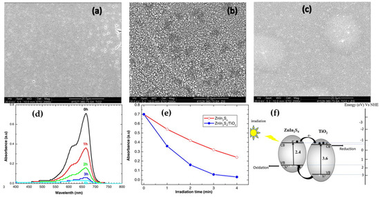 SEM images of (a) TiO2 thin films, (b) ZnInS4, and (c) ZnInS4/TiO2; (d) the absorption spectra of MB along with time under the irradiation of visible light; (e) the photocatalytic removal of MB with ZnInS4 and ZnInS4/TiO2 under visible light irradiation; (f) photocatalytic schematic diagram of ZnInS4/TiO2 heterojunction, reproduced with permission from [126]. Copyright 2015, Elsevier B.V.