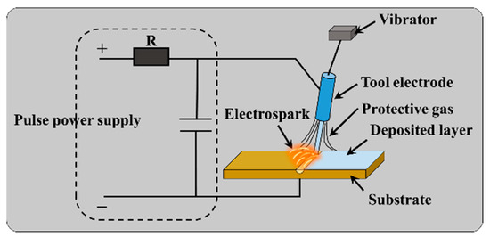 The ESD technique utilizes the pulsed spark discharge between the metal substrate and the electrode, enabling the electrode material to melt and infiltrate into the surface layer of the metal substrate under high temperature (5 × 103~2 × 104 °C) and high pressure, forming a surface–alloyed deposition layer with special properties and metallurgical bonding to the substrate [25,26]. This treatment optimizes the physicochemical properties of the substrate surface and improves the hardness, wear resistance, and corrosion resistance of the original substrate material to a certain extent [27]. Figure 1 illustrates the working principle of the ESD technique. The ESD technique involves highly complex physical, chemical, energy conversion, and thermodynamic reactions [28]. It is challenging to systematically study the transient (10−6~10−5 s) discharge effects, which poses certain obstacles to the research on the film formation mechanism of ESD technology [29]. However, researchers continue to explore and study the process’s shortcomings and improvement methods.