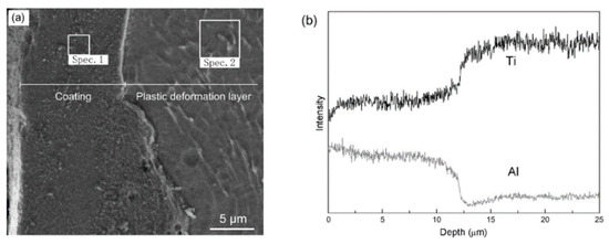 Liu et al. [41] used electrical discharge deposition to prepare Ti–Al intermetallic compound coatings on the surface of a Ti–6Al–4V alloy. Through investigations of the coating’s chemical state, microstructure, phase composition, microhardness, and surface residual stress, they discovered many new Ti–Al intermetallic compounds different from the deposition material formed, along with a small amount of Al2O3 in the coating. The high energy of electrical discharge promotes interdiffusion and chemical reactions between the elements. Figure 2 shows the cross–sectional microstructure and elemental distribution. It can be seen that the Al element and Ti element have obvious mutual diffusion behavior from the coating to the substrate, and the diffusion zone is 5 μm, that is, from the coating at 10 μm to the titanium substrate at 15 μm. Wang et al. [24] investigated the feasibility of using the electrical discharge deposition process to prepare Ti–Cu flame–retardant coatings. The Ti–Cu coating surface exhibits a typical splatter appearance, with different compositions and phases within individual splatters. The coating structure presents a river–like and hilly–valley–like morphology, featuring numerous nanoscale porosities and trumpet–shaped splatters. Tensile residual stress in the Ti–Cu coating leads to longitudinal cracks terminating at the interfaces. Secondary layers with layer–layer interfaces are present in the coating. Moreover, the Ti–Cu coating is primarily composed of Ti3Cu, Ti2Cu, Ti3.3Al, and Ti, with a hardness of 760 HV0.05/10, greatly improving the surface performance of the substrate.