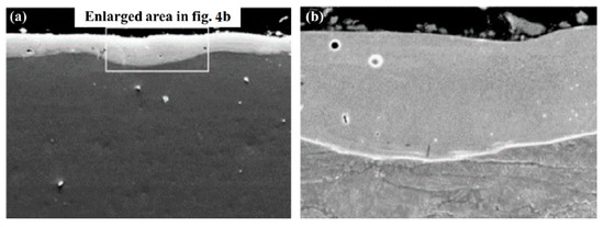 SEM cross–section images of WC92–Co8 coating on Ti alloy. (a) Macroscopic view; (b) enlarged area. Reprinted with permission from Ref. [44] Copyright 2004 Elsevier.
