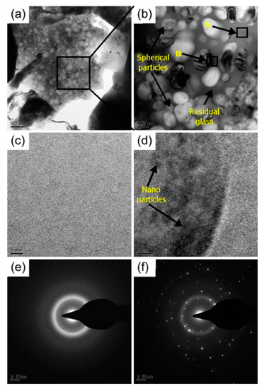 TEM images and selected area electron diffraction patterns of the coating: (a) TEM bright field image; (b) magnified view of (a); (c) HRTEM image of area A in (b); (d) HRTEM image of area B in (b); (e) electron diffraction patterns of area A in (b); and (f) electron diffraction patterns of area B in (b). Reprinted with permission from Ref. [45] Copyright 2015 Elsevier.