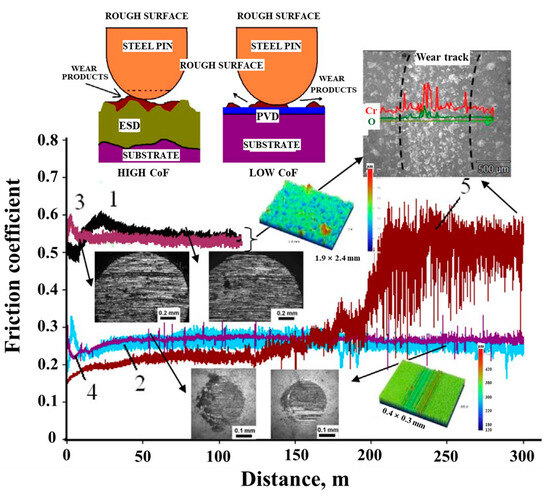 Friction coefficients and sliding distance with corresponding SEM and optical profilometry images of tribological contact areas. Scheme illustrating the different wear behavior of ESD and MS coatings. 1—ESD (Ra = 8 μm), 2—MS (Ra= 0.05 μm), 3—MS–ESD (Ra = 8 μm), 4—MS–ESDpol (Ra = 0.1 μm), and 5—ESDpol (Ra = 0.1 μm). Reprinted with permission from Ref. [45] Copyright 2018 Elsevier.
