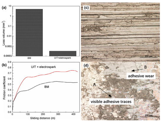 (a) Wear results; (b) friction coefficient; and wear scars (c) on the base material and (d) on the sample treated with combined UIT and electrospark processing. Reprinted with permission from Ref. [52] Copyright 2014 Elsevier.