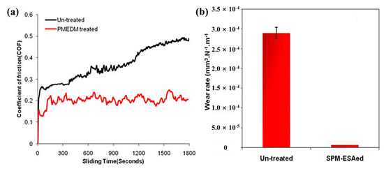 (a) COF curves and (b) specific wear rate for untreated and SPM–ESA treated β–Ti implant. Reprinted with permission from Ref. [57] Copyright 2017 Elsevier.