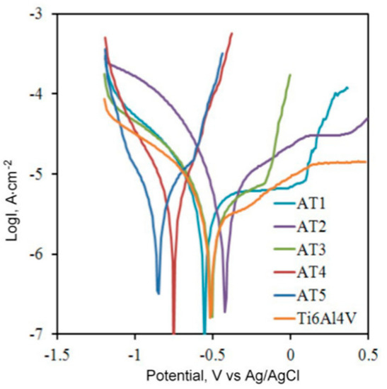 During application, titanium alloys inevitably experience component failures such as hydrogen embrittlement, corrosion fatigue, and stress corrosion cracking. Spark deposition technology can produce corrosion–resistant coating surfaces, which mainly depend on the physicochemical properties of the oxide film formed on the coating surface and the heterogeneity of the surface structure [58]. The improvement in corrosion resistance is mainly attributed to the uniform surface microstructure and the absence of grain boundaries [59]. Coatings with high corrosion potential and low corrosion current density exhibit lower corrosion rates, thus demonstrating excellent corrosion resistance on the coating surface. Research has shown that titanium (Ti) and its alloys exhibit excellent corrosion resistance in HNO3 due to the formation of protective and self–adherent oxide films [60]. Burkov et al. [36] used the spark deposition technique to form Ti–Al intermetallic compound coatings on a Ti–6Al–4V alloy utilizing a mixture of titanium and aluminum particles. Figure 13 depicts the polarization curves of different coating samples in a 3.5% NaCl solution. The results indicate that samples with a higher aluminum content (AT3–AT5) exhibit higher polarization resistance values and corrosion potentials. Samples with a higher titanium content (AT1–AT2) have lower Rp and comparable corrosion potentials, indicating that coatings with higher aluminum content possess good corrosion resistance.