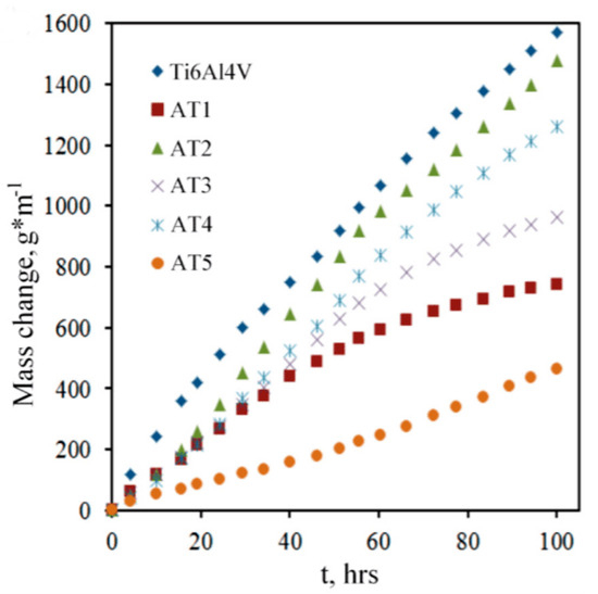 Titanium alloys react with oxygen during service, resulting in decreased plasticity and embrittlement when the oxygen concentration is too high [67]. The formation of the metal oxide film follows the oxidation reaction mechanism proposed by Wagner [68]. The surface strengthening of titanium alloys through electrical discharge deposition technology can enhance their high–temperature oxidation resistance. For example, Burkov et al. [36] prepared coatings of an intermetallic Ti–Al compound on the surface of a Ti–6Al–4V alloy using electrical discharge treatment, and studied the kinetics of mass change of the coating samples and the Ti–6Al–4V alloy at a temperature of 900 °C (Figure 15). With an increase in aluminum concentration in the particle mixture, the phase composition of the corresponding coating changes from titanium–rich aluminides (Ti3Al) to aluminum–rich aluminides (TiAl3). The coating samples improve the oxidation resistance of the Ti–6Al–4V alloy at 900 °C by 1.1–3.4 times, with the highest aluminum content exhibiting the best oxidation resistance.
