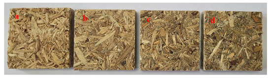 Particleboards with different ratios of AC addition: (a) 0% AC, (b) 1.5% AC, (c) 4.5% AC, (d) 7.5% AC.