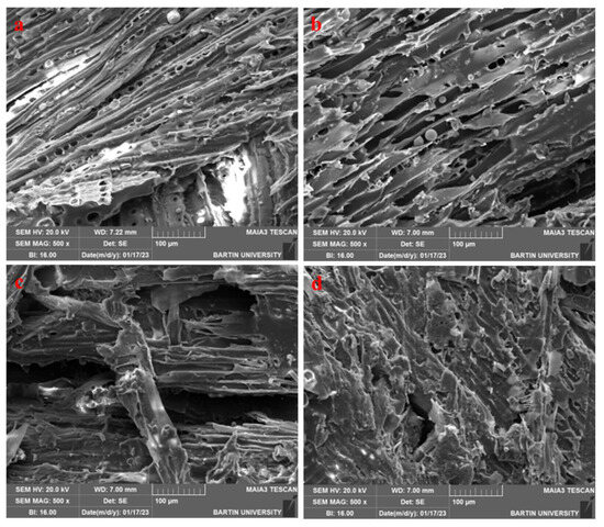 The microstructures of the particleboards were examined using a scanning electron microscope (SEM) at ×500 magnification, as shown in Figure 3.