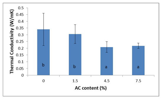 The thermal conductivity values of AC-reinforced particleboards. The letters (a and b) in Figure 4 indicate that the sample groups with equal importance are clustered together.