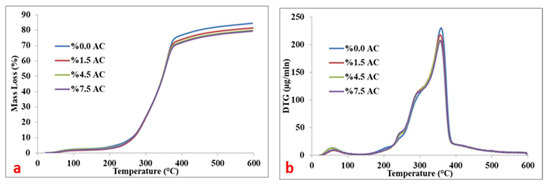 The TG (a) and DTG (b) results of AC-reinforced particleboards.