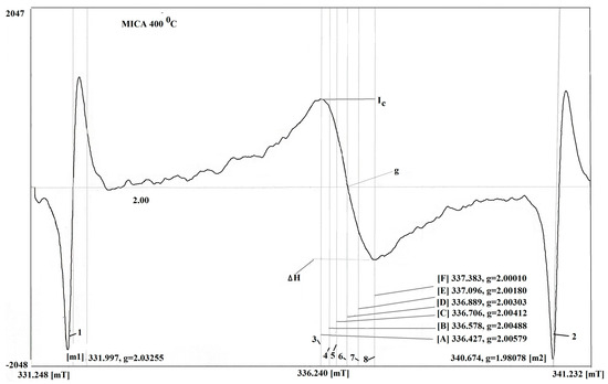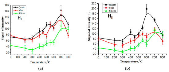 Figure 3a,b shows that the EPR signal has one characteristic temperature region. The growth of the EPR signal with the temperature in the studied samples was observed in the interval T = 400–700 °C when measured in the parallel position of the sample plane relative to the direction of the magnetic field (Figure 3b). In both orientations of the measurements at temperatures above 750 °C, they are transformed in one EPR line, which significantly decreases at 800 °C.