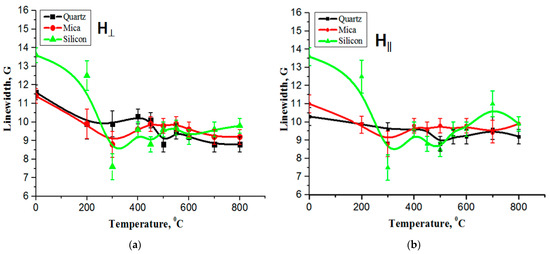 Figure 4a,b illustrates the temperature dependencies of the EPR line width for the carbon film on quartz, mica, and silicon substrates. The measurements were taken with the sample plane oriented both perpendicular and parallel to the direction of the magnetic field. It is known [22] that the EPR line width strongly depends on the microwave power, temperature, and amplitude of the magnetic field modulation. As the temperature increases, the line width of the carbon film on quartz and mica does not change.