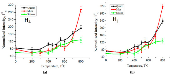 Figure 3a,b depicts the temperature dependencies of the EPR signal intensities for the carbon film on quartz, mica, and silicon substrates. The measurements were taken with the sample plane oriented both perpendicular and parallel to the direction of the magnetic field. These figures provide information about how the EPR signal intensities change with the temperature for different substrate materials and the orientations of the sample relative to the magnetic field. These data can be used for understanding the behavior of the carbon film under varying. The figure shows that when the temperature changes from room temperature to 250–300 °C, the amplitude of the EPR signal decreases to an obvious extent, and then increases with the increasing temperature for all of the samples.