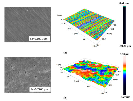 SEM (left) and AFM (right) measurements of surface topology before and after fs-laser treatment. (a) Surf 1 and (b) Surf 2.