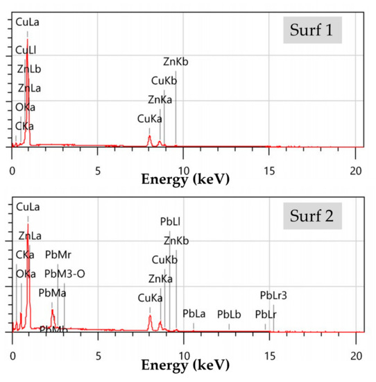 The testing sample was copper alloy (brass H59, Guangdong Guangouli Metal Material Co., Ltd., Guangzhou, China) manufactured using CNC milling machining into a 0.5 cm thick and 16 cm2 area copper block, which was placed on the cooling platform of the refrigeration system. The surface of the copper block was sanded with 1500- and 3000-grit sandpapers and polished with grinding paste to obtain a smooth surface (Surf 1). Subsequentially, the surface was etched using an ultrafast laser available in a femtosecond (fs) pulse duration to create a certain roughness and was exposed to ambient for a week (Surf 2). The fs-laser processing on the copper surface was achieved using a linearly polarized beam with a wavelength of 800 nm, a repetition rate of 200 kHz and a pulse duration of 600 fs. The beam had a power of 8 W focused on a spot size of 30 μm. The surface morphology of both the original copper surface and fs-laser-treated surface was measured using a scanning electron microscope (SEM) (Tescan, Brno, Czech Republic) and atomic force microscope (AFM) (Hitachi, Ltd., Tokyo, Japan), as shown in Figure 3. The surface roughness (Sa) was measured to be 0.1001 μm before treatment and 0.7760 μm after laser treatment (>7 days after the treatment). An energy dispersive spectrometer (EDS) analysis was used to quantify the chemical element composition of the surface. The elemental composition of the copper surface shown in Figure 4 and the results listed in Table 1 suggest a change in the chemical composition of the copper surface after the fs-laser processing. The oxygen atomic amount increased from 3.83% (Surf 1) before treatment to 19.44% (Surf 2) after laser treatment (>7 days after the treatment). The fs-laser-treated surface formed an oxidation layer with a thickness () of a few micrometers [39]. The fs-laser-treated surface presented a higher hydrophobicity than the original smooth copper surface since it changed in roughness and chemical properties.