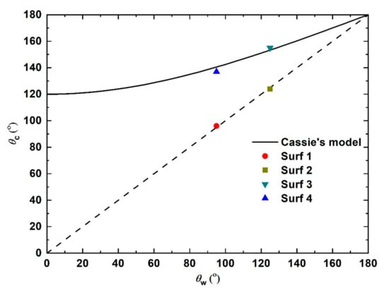The contact angle measured on the testing surfaces and the theoretical prediction using Cassie’s model.