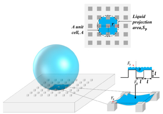 Different from the state of the droplet on the smooth surface, two different morphological characteristics presented on the microstructure surface, i.e., Wenzel state and Cassie state. The Wenzel state droplet infiltrates into the microstructure and increases the contact area between the droplet and the surface. The Cassie state droplet, as shown in Figure 7, is in a nonwetting state and reduces liquid–substrate contact fraction, which presents a superhydrophobic property, i.e., large contact angle and low hysteresis. is the liquid–substrate contact area fraction, as aforementioned. As we consider a unit cell, assuming that the micropillar size is equal to l, for the micropillar array is 0.25. Also, the contact line density (CLD, ) is represented as the actual liquid–substrate contact lines (L) in the area of a unit cell (A).